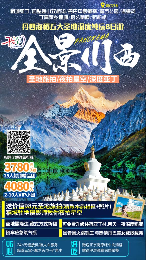 四姑娘山雙橋溝景區(qū)+丹巴甲居藏寨+墨石公園+塔公草原+新都橋+天路十八彎+卡子拉山埡口+理塘+紅草地+尊勝塔林+亞丁風(fēng)景區(qū)+磨西古鎮(zhèn)+海螺溝國(guó)家森林公園