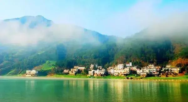 湖水環(huán)抱粉墻黛瓦的村莊,荷花盛開水蓼飄搖