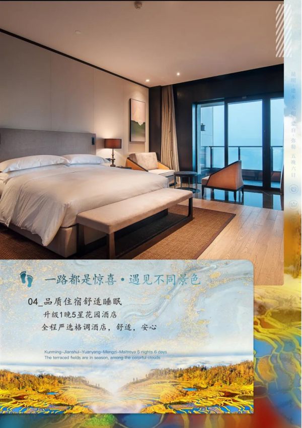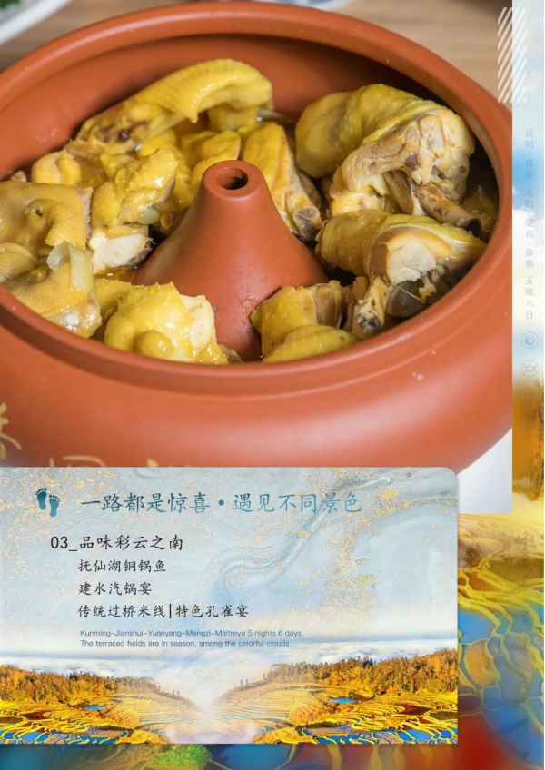 2.餐飲:正餐十菜一湯、(過橋米線除外)十人一桌,共5早8正; 10人一桌,每桌十菜一湯,餐標(biāo):30元,特色風(fēng)味餐餐標(biāo)40-50元/人。酒店含早。如兒童不占床,需按照當(dāng)?shù)貙嶋H產(chǎn)生費用自理早餐費。若客人自愿取消行程中所含正餐,視為自愿放棄,不退費;