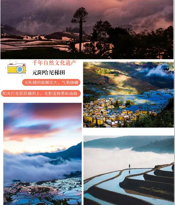 后參觀【菁口梯田】:千年來哈尼族人民一厘一寸開墾耕耘出來的大地的五線譜。參觀哈尼特色民族蘑菇房,狀如蘑菇,與巍峨的山峰,迷人的云海、多姿的梯田,構(gòu)成了一幅奇妙的哀牢山壯景 。