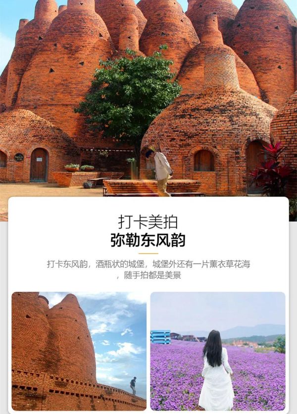 后前往彌勒,游覽【東風(fēng)韻】(含電瓶車),被稱為東方波爾多,萬畝碧綠的葡萄園,夢幻無際的紫色薰衣草,醉了每一個走進東風(fēng)韻的人,順著中國最大的的紅磚建筑群萬花筒藝術(shù)莊園,一路走來,藝術(shù)的熏陶和美麗的風(fēng)景融為一體,讓您感受難得的東風(fēng)韻。游覽結(jié)束后入住石林溫泉酒店,體驗溫泉給身心的放松。