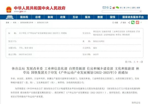 體育總局 發(fā)展改革委 工業(yè)和信息化部 自然資源部 住房和城鄉(xiāng)建設(shè)部 文化和旅游部 林草局 國(guó)鐵集團(tuán) 關(guān)于印發(fā)《戶外運(yùn)動(dòng)產(chǎn)業(yè)發(fā)展規(guī)劃(2022-2025年)》的通知