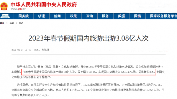文旅部的數(shù)據(jù)顯示,今年春節(jié)假期,全國國內(nèi)旅游出游3.08億人次,既超過了行業(yè)預期,又達到了2019年同期。2023旅游市場開局良好,為文旅行業(yè)打開了希望之門。