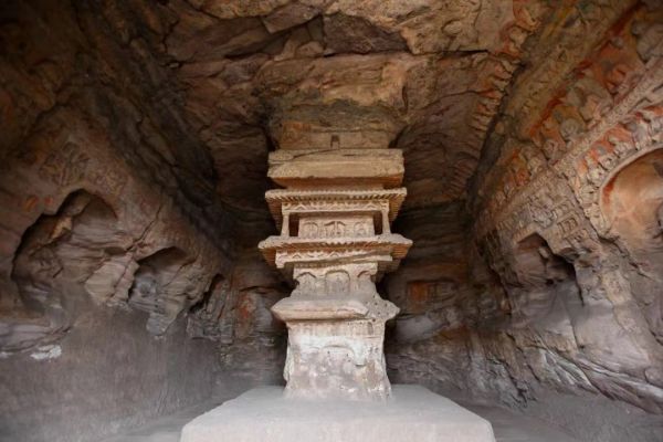 第一、二窟為一組塔廟雙窟,窟外兩側(cè)各殘存一座單層方塔,建造于公元471~494年。