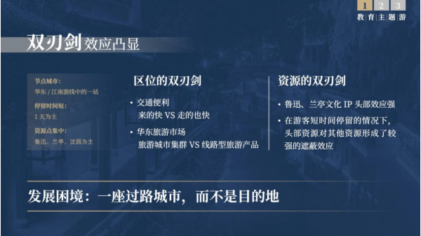 20年前,當全國旅游還普遍處在觀光游階段時,紹興已經(jīng)開啟了主題游的布局,并將主題錨定在了教育的要素之上。紹興依托于自身資源優(yōu)勢和區(qū)位優(yōu)勢,率先在全國提出了“跟著課本游紹興”的概念。用“課本”來解讀城市,巧妙地將紹興豐富的資源與每一位游客產(chǎn)生了關聯(lián)。讓紹興的資源成為每一個人在課本上看到的學到的知識點的真實場景。這一概念的提出助力紹興成為中國最早“旅游+教育”跨界融合的典范型城市。