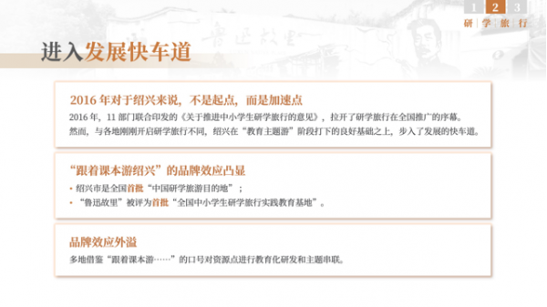 在這一時期,紹興還將“跟著課本游紹興”的概念落到了產(chǎn)品端上,推出了一系列具有體驗性的教育旅游產(chǎn)品。這些產(chǎn)品兼具趣味性和參與性。當時紹興推出的教育旅游產(chǎn)品已經(jīng)涵蓋了 “修學手冊”、“隨堂練習”、“結業(yè)證書”等環(huán)節(jié),已十分接近如今專業(yè)的研學旅行課程。說明在這一時期,紹興從思想概念到產(chǎn)品設計都走在了全國的前列。