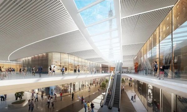 “雙首層”商業(yè)空間,貫通南北兩中庭。首層開辟一條環(huán)繞北中庭、連通東西出入口的“天街”,頂部鋪設(shè)大面積玻璃天幕,自然更迭、星云變幻的景象透過天幕延伸至室內(nèi),為商業(yè)街區(qū)增添沉浸式體驗(yàn)。