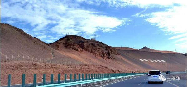 上車很快就路過火焰山,昨天我們酒店的一個(gè)顧客說,地表溫度達(dá)到了72度,手機(jī)報(bào)警不能開機(jī),我們現(xiàn)在車?yán)镲@示是是40度也沒敢下車。再向前走,一路上周邊都是葡萄干的晾曬房,一個(gè)接著一個(gè),絡(luò)繹不絕。