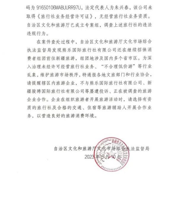 通報指出,經(jīng)查,熊樂國際旅行社有限公司因多次存在惡意“甩團(tuán)”行為,已被海南省??谑型V沽撕D鲜÷糜坞娮有谐滔到y(tǒng)的使用,不允許該社以團(tuán)隊名義購買景區(qū)門票。新疆駿騁國際旅行社有限公司,無經(jīng)營旅行社業(yè)務(wù)資質(zhì)。新疆維吾爾自治區(qū)文化和旅游廳已成立專案組,調(diào)查上述旅行社的違法違規(guī)行為。