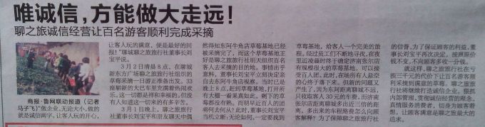 3月1日晚上,聊之旅旅行社董事長劉寶平和朋友聊天中偶然得知東阿牛角店草莓基地已經(jīng)被采摘完了,而這個草莓基地正好是聊之旅旅行社明天組織百名客人去采摘的目的地。事情出乎意料,董事長劉寶平當(dāng)即立刻決定親自去東阿牛角店視察。當(dāng)時已是晚上8點(diǎn),趕到草莓基地,打開所有大棚一看果真如此,剩下的草莓都沒有熟。而明早近百人的團(tuán)將何去何從?此時此刻,董事長劉寶平當(dāng)機(jī)立斷:無論如何,一定要找到草莓基地,給客人一個完美的旅程。經(jīng)過員工們不斷地尋找,在夜里近凌晨時終于確定濟(jì)南張爾店有規(guī)模很大的草莓基地,可以接受百人團(tuán)。此時,在場所有人懸空的心終于落下來。但新的問題又產(chǎn)生了,因?yàn)闁|阿距離聊城不遠(yuǎn),只收取客人30元的車費(fèi)。而濟(jì)南張爾店距離聊城多出近三倍的距離,多出來的車程路費(fèi)怎么向顧客解釋?為了保障聊之旅旅行社的信譽(yù),為了保證顧客的利益,董事長劉寶平再次決定,按照原價錢不變,不向顧客多收一分錢。