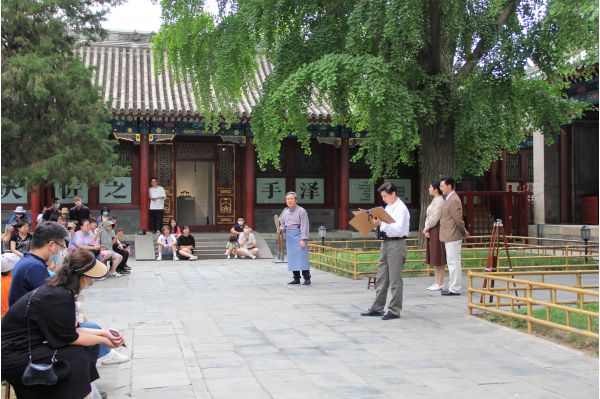 劇中,1937年七七事變前夕,為盡可能保留華北古建筑資料,梁思成、林徽因等對(duì)重要古建進(jìn)行搶救性測(cè)繪,在恭王府巧遇古建老匠人,自此展開(kāi)了一段長(zhǎng)達(dá)20余年的知己相交之緣。在室外的第一幕表演結(jié)束后,主演們會(huì)引導(dǎo)觀眾從嘉樂(lè)堂院落走進(jìn)主殿;而在觀眾駐足展廳中的老式監(jiān)視器前,看完黑白默片版的話劇第二幕之后,演員們又會(huì)走進(jìn)展廳,開(kāi)始第三幕的表演。