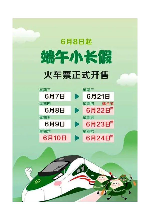 今年端午節(jié)從6月22日至24日放假調(diào)休,共3天。按照目前全國(guó)鐵路車(chē)票預(yù)售期15天的規(guī)定,6月8日起,旅客可以通過(guò)鐵路12306網(wǎng)站、鐵路12306APP購(gòu)買(mǎi)6月22日的火車(chē)票,6月10日起,可購(gòu)買(mǎi)6月24日的火車(chē)票。