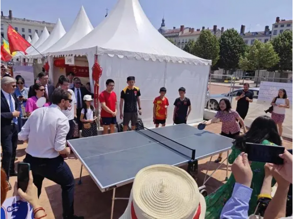 陸青江總領(lǐng)事陪同里昂市長(zhǎng)杜塞、副市長(zhǎng)茲多羅夫佐夫等來(lái)賓參觀中國(guó)展棚,法國(guó)小熊貓學(xué)校鄧翔教練帶領(lǐng)小熊貓乒乓球隊(duì)的三位省級(jí)冠軍球員陳玉麒、陳玉麟和柯弘毅組成“小熊貓乒乓天團(tuán)”,現(xiàn)場(chǎng)做了精彩表演,并和市長(zhǎng)及總領(lǐng)事進(jìn)行乒乓球?qū)Υ蚓毩?xí)。隨后,杜塞市長(zhǎng)還興致勃勃的同陸總領(lǐng)事打起乒乓,并表示充分感受到中華文化的博大精深和中華體育之美。
