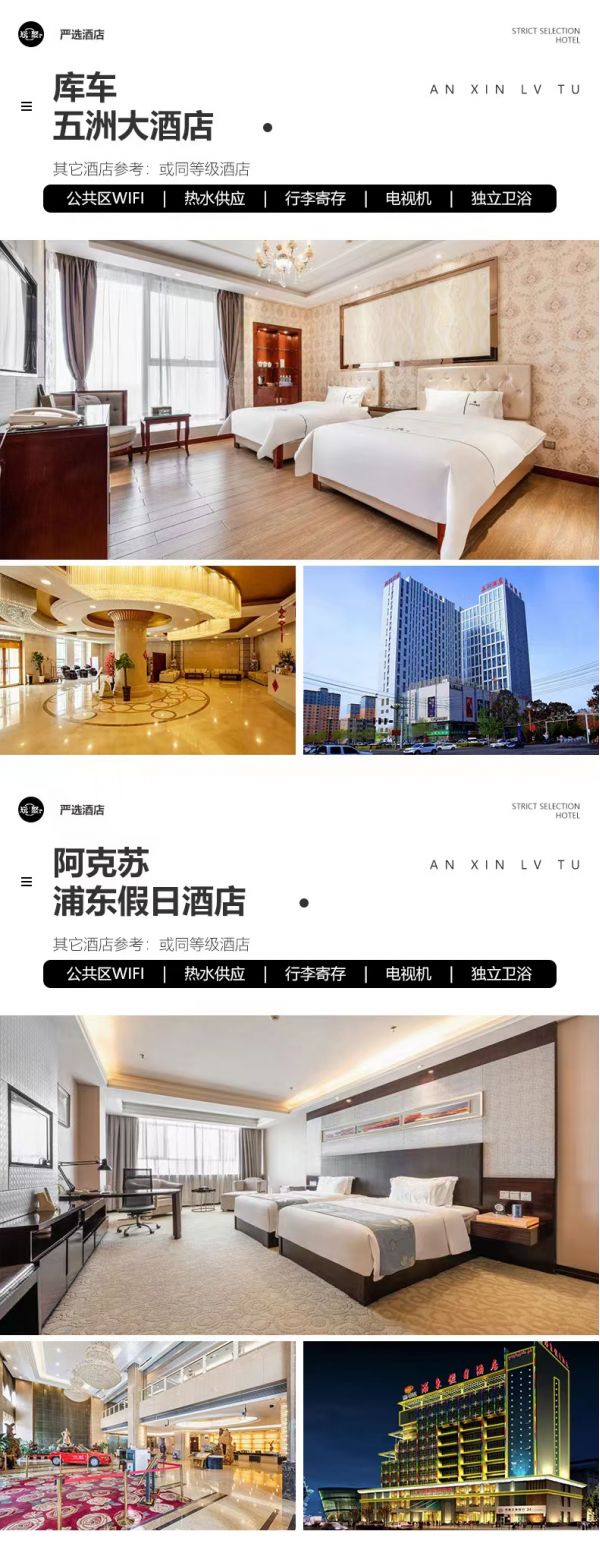 盡覽天山神秘大峽谷的風光后,我們驅車前往【庫車】。庫車是獨庫公路天山南端的終點,同時也是一座濃縮了西域時光、記錄了老城在現代文明中消逝和新生的異域風情小城。在庫車老城街道,一幢幢藍白色的小房子林立,彩色門扉,門口種了各式的綠植和鮮花,整條街道仿若北歐小鎮(zhèn),是很多小姐姐拍照打卡必去之地。我們還將去參觀【庫車大寺】,庫車大寺,是信奉伊斯蘭教的人民群眾做禮拜的宗教場所,大寺坐落在新疆庫車縣城黑墩巴扎最高處。是新疆境內僅次于喀什艾提尕清真寺的第二大寺。大寺門樓高18.3米,全部青磚砌成,高聳的門樓與宣禮塔,莊嚴挺拔。塔柱雕以伊斯蘭風格圖案,穹窿式樓頂,形似天宇,寺內禮拜大廳1500平方米,可容納3000人大禮拜。晚上我們還將去逛一逛庫車的夜市,自行嘗一嘗酸奶刨冰、羊肉、馕等當地特色小吃。