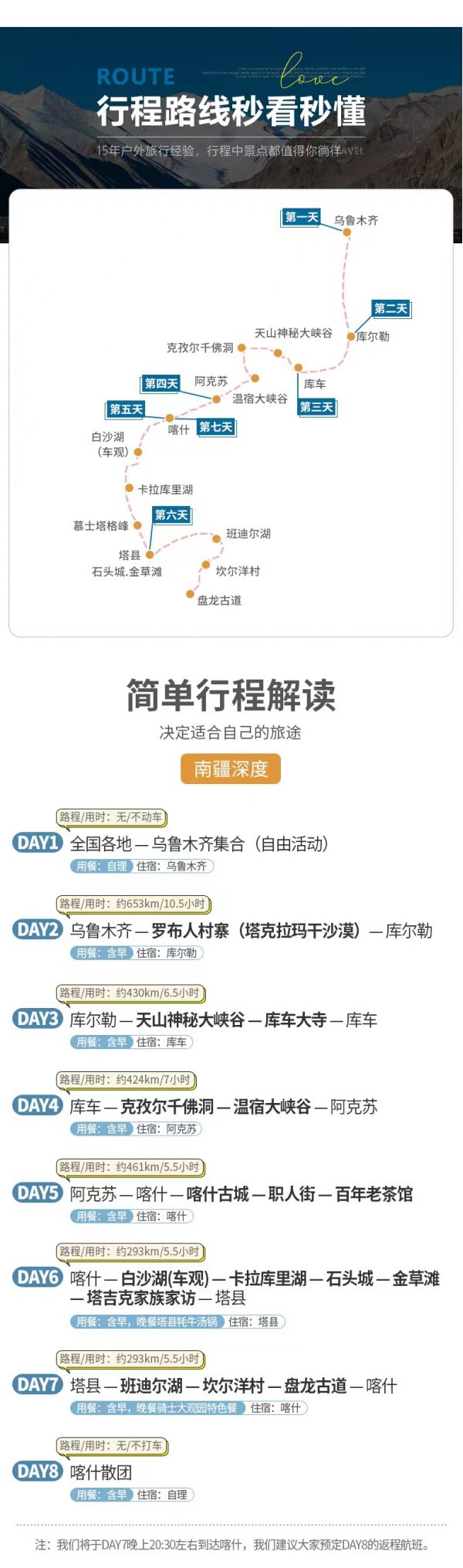 我們將于今天晚上20:30到達喀什,我們特意免費贈送一晚喀什酒店住宿,給您時間緩解旅途的疲憊,返程不匆忙。