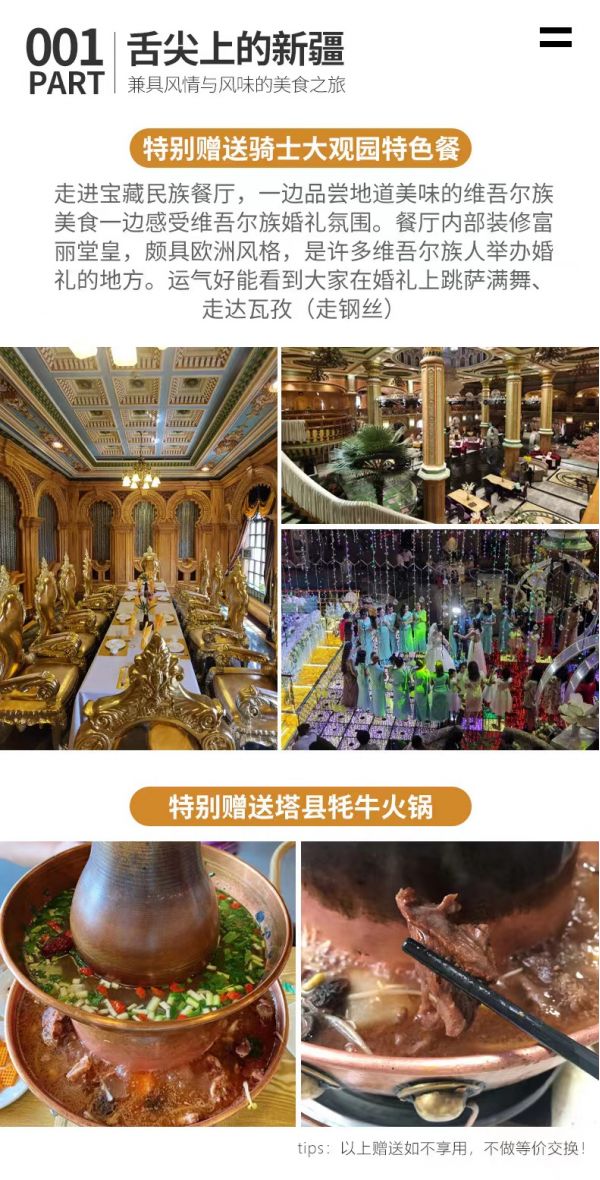 晚上驅車到達喀什,今晚大家可以進到頗具新疆特色的騎士大觀園餐廳,品嘗新疆特色美食。這個寶藏民族餐廳,內里裝修金碧輝煌,因此很多維吾爾族人會選擇這里舉行婚禮。如果足夠幸運,我們可以見證維吾爾族人的婚禮,并欣賞他們在婚禮上表演歌舞。