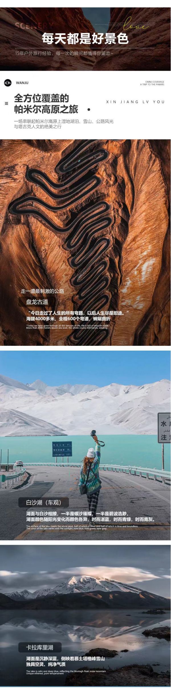 “今日走過了人生的所有彎路,以后人生盡是坦途?!边@是出現在新疆帕米爾高原盤龍古道兩頭的宣傳語。繼續(xù)前行,我們會遇見著名網紅打卡地【盤龍古道】。這條70多公里的馬路,卻有600多個彎道,海拔最高有4000多,從山頂俯瞰整個古道,蜿蜒曲折,遠方還有連綿不斷的雪山,視覺效果十分震撼。