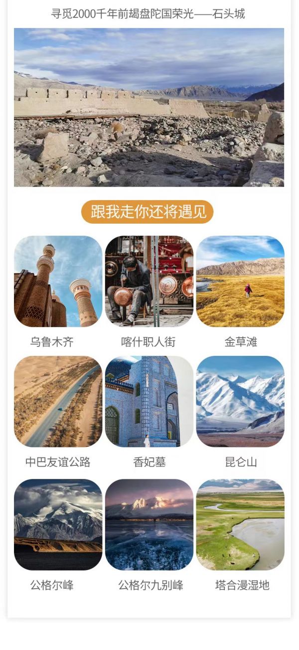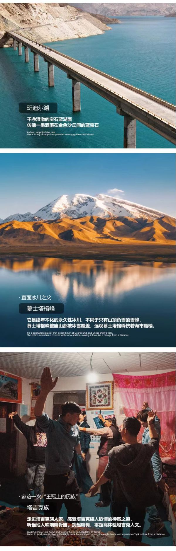 告別“東方摩洛哥”—喀什,我們將開啟一段帕米爾高原之旅。沿314國道一路暢游帕米爾高原風光,首先驚艷我們的是背靠白色沙丘和雪山的【白沙湖】,在陽光的變化下,湖水時而呈湛藍色,時而呈綠色。更令人驚嘆的是,藍色的湖面與白沙相接,一半藍一半白,而白沙背后還有雪山。在雪山和白沙的映襯之下,白沙湖水更顯澄澈。在這里能get湖泊、白沙、雪山同框的畫面。分享一個冷知識:白沙湖又名流沙河,就是西游記里唐僧收服沙和尚的地方。我們還能途觀慕士塔格峰,山頂常年皚皚白雪,猶如滿頭白發(fā),十余條冰川鑲嵌在峰體下的峽谷中,如胸前飄動的銀須,故有“冰山之父”的美稱。隨后我們將遇見【卡拉庫里湖】,這里能看到雪山倒映在湖面的風景,拍出來的照片特別的給人純凈的感覺。