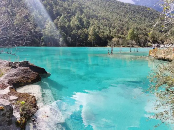 天泛小雨,卻依然打破不了藍(lán)月谷湖水的平靜,它比翡翠更通透,更亮麗。美得沁人心脾。
