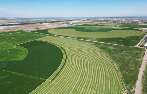 航拍鏡頭下的苜蓿收割蔚為壯觀。
