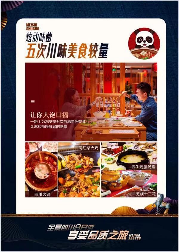 3.游覽結(jié)束后前往入住酒店,晚餐贈送特色四川火鍋,讓您品嘗四川火鍋的麻,辣,鮮,香,輔以四川特色名小吃,晚餐后贈送觀看集川劇變臉、峨眉武術(shù)、歡樂彝家等絕技 60 分鐘的演出。