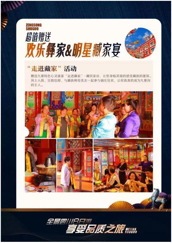 2.晚贈送九寨特色心靈盛宴“走進藏家”--藏民家訪,讓您身臨其境的感受藏族的建筑、風(fēng)土人情、宗教信仰,與藏族帥哥美女一起參與鍋莊狂歡,讓你真真的成為九寨溝的主人。大家圍成一個圈,吃吃喝喝,再看看表演,可以品嘗到九寨溝具有特色美食:藏家土火鍋(此項目為贈送,如若不參加,旅行商不能退還門票費。)