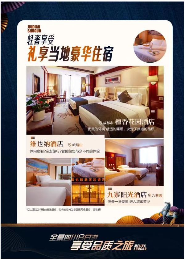【酒店】:成都四晚酒店住宿,九寨溝二晚酒店住宿,峨眉山一晚酒店住宿,每人一個床位,如有損壞或房間內(nèi)個人消費,敬請自理。行程所列酒店住宿,每人一個床位,,如有損壞或房間內(nèi)個人消費,敬請自理。每人1床位。2人以下單床位的,必須補房差,3人以上可補房差亦可安排加床(加床為鋼絲床或床墊)或三人間(部分酒店無三人間)以酒店提供為準(zhǔn),費用同正常床位;不提自然單間和拼房服務(wù),亦不接受樓層及特殊房型指定;因計劃用房,房差需于出行前團款中付清;行程內(nèi)酒店住宿押金均為游客自付自退住宿酒店已列出,敬請百度,如行程提供標(biāo)準(zhǔn)無法滿足您對酒店的要求,請更換其它更高標(biāo)準(zhǔn)的產(chǎn)品。酒店未達到個人住宿標(biāo)準(zhǔn)的不屬于旅游行程質(zhì)量范疇。遇特殊原因(如天氣,交通,地面,酒店接待能力),我公司會依當(dāng)時情況調(diào)整行程中標(biāo)明的備選酒店,但不會安排行程中未涉及到的酒店,也不會影響游客的行程安排。