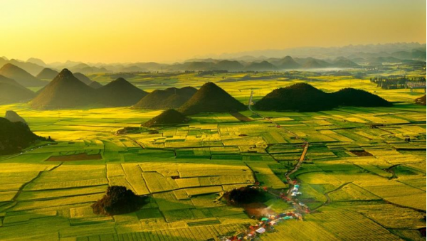 羅平是全國有名的油菜籽生產(chǎn)基地,氣候溫和,雨量充沛,年降雨量1700毫米,十分利于油菜生產(chǎn)。陽春二月,30萬畝油菜花把羅平的大地裝點得一片金黃,羅平壩子里15萬畝油菜形成了一個大花園,遼闊無邊。舉目四望,那一望無際的花海中時有錐狀峰叢,在無垠的花海中聳起,連綿起伏,變化萬千,花姿、花影、花浪、花潮使人陶醉。油菜花的奇觀,點綴著富饒美麗、多姿多彩的迤東大地。