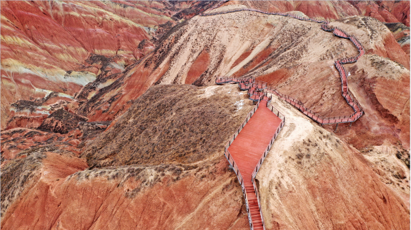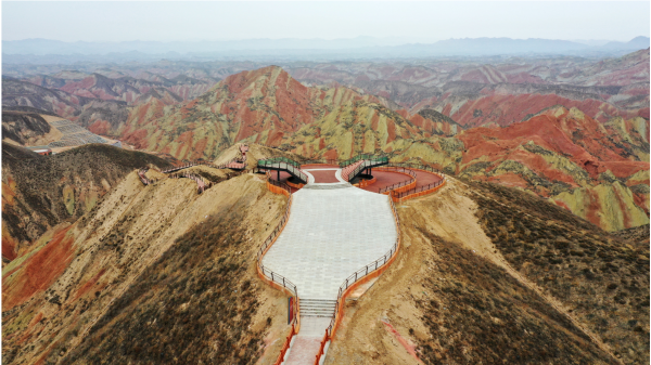 沿著棧道蜿蜒向上,隨著視角逐漸抬高眼前的水墨丹霞景區(qū)美景,絲路霞光、九色丹青、丹頂攬勝,更遠方景區(qū)的天際線盡收眼底。
