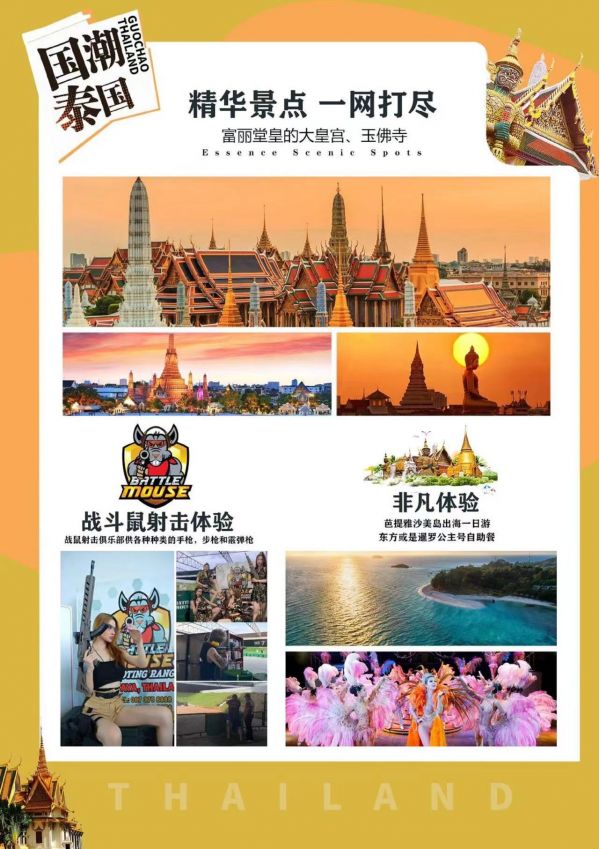 酒店早餐后前往參觀【珠寶展覽中心】 (約 180 分鐘) 此有各式各樣的紅寶石《代表愛情及幸福,象征 著熱情、仁愛、威嚴》、藍寶石《代表貴族,象征著慈愛、誠實、德望》以及黃寶石《代表招財, 象征著健康、長壽》,可以在這里選擇到適合自己喜愛的寶石。泰國被公認為是世界上首屈一指的 寶石及珠寶中心之一,經(jīng) ISO-9001:2000品質認證。【戰(zhàn)斗鼠射擊】戰(zhàn)鼠射擊俱樂部位于芭提雅,占地20萊,是一個室內射擊館, 擁有IDPA及IPSC訓練資質。館內各項設施齊全,整個區(qū)域都安裝有空調,設有專門的人休閑放松區(qū)域。 戰(zhàn)鼠射擊俱樂部供各種種類的手槍,步槍和霰彈槍,包括:Smith&Wesson 686和1522,Glock 9mm,Colt Gold Cup 45或CZ 455。子彈規(guī)格范圍有.22LR,.38ACP,.9MM,.45 ACP等規(guī)格。暹羅爽泰莊園【騎大象】坐在象背上起起伏伏,穿梭在熱帶雨林中,您仿佛進入了一個天然大氧吧,靜下心來還能聆聽到叢林深處的幽幽鳥啼和潺潺溪流聲,可別忘了和憨態(tài)可掬的大象合影留念?!?strong>熱帶水果園】果園占地面積有幾百畝大,里面栽種著各五花八門的熱帶水果,有葡萄、山竹、榴蓮、紅毛丹、椰青和火龍果等。味道鮮美的水果任您品嘗,還可以享受回歸大自然的樂趣?!?strong>東方公主號或暹羅公主號】聞名遐邇的并不是暹羅灣夜景,而是東方公主們 的美麗。泰國人妖的精湛歌舞表演令很多人對臺上的麗人們雌雄難辨,在船上我們將與她們近距離接觸。為您端菜、 與您共舞的都是盛裝美麗的人妖公主,在此提醒大家,若被人妖“騷擾”,最好定氣凝神、泰然處之。