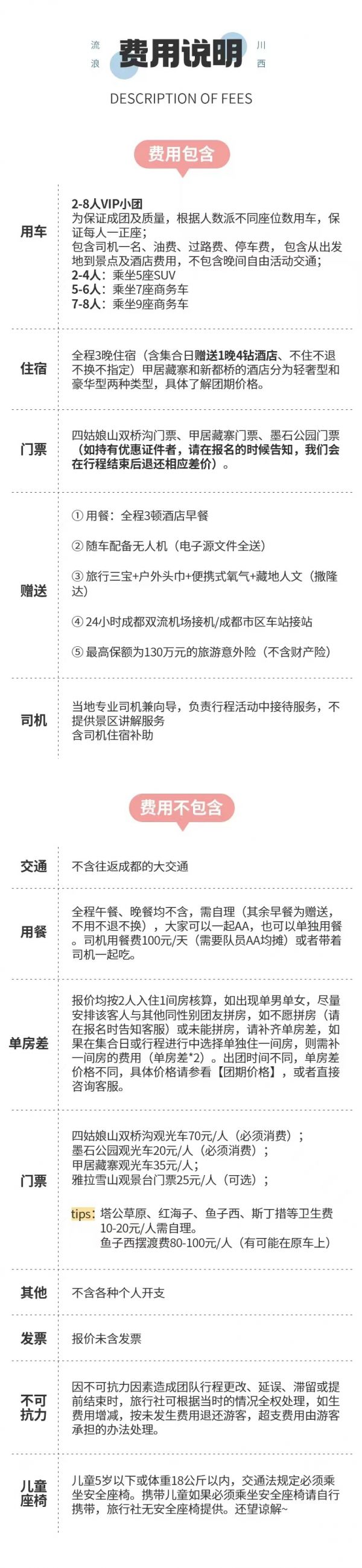 海拔說(shuō)明:3630-4200-4260-4000-2560-540m隨預(yù)計(jì)晚上19:00 成都上車(chē)點(diǎn)散團(tuán),結(jié)束愉快的5天旅程。