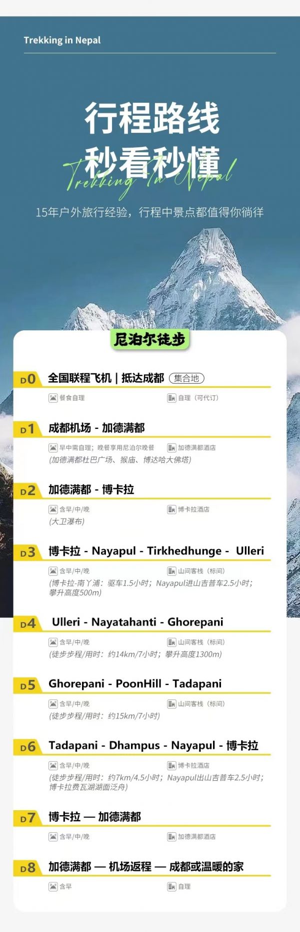 請(qǐng)對(duì)應(yīng)使用我方尼泊爾徒步8日行程,因使用其它行程造成的投訴,責(zé)任自負(fù);請(qǐng)仔細(xì)閱讀以上行程文檔,同意并保證遵守我方安排,以免為您帶來不必要的麻煩;如產(chǎn)生合同糾紛或人身意外事故,按《中華人民共和國合同法》、《道路交通法》、《保險(xiǎn)賠償條例》裁定;本行程作為旅游合同附頁與旅游合同同等法律效力。