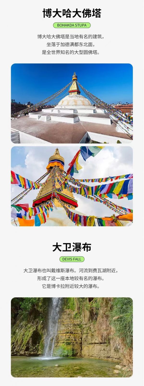 吃完酒店早餐后,我們從加德滿都出發(fā)經(jīng)過約6-7小時(shí)(不堵車情況下)車程抵達(dá)博卡拉。下午游覽探不可測(cè)的大衛(wèi)瀑布(devi‘s fall),博卡拉被譽(yù)為南亞瑞士,其湖光山色和閑適的生活很適宜忙碌的人們假期來此享受短暫而寧靜的美好時(shí)光。