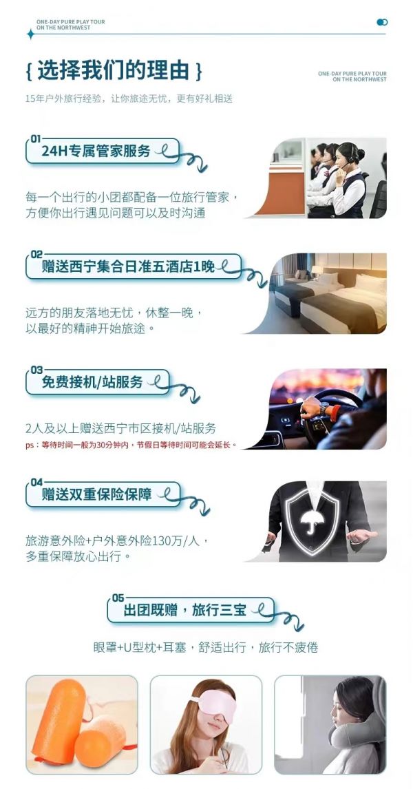 集合時(shí)間:以出團(tuán)通知為準(zhǔn)接機(jī)/站服務(wù):本次活動(dòng)提供西寧市內(nèi)24小時(shí)接機(jī)/接站服務(wù),工作人員會(huì)在您出發(fā)日期前一天21:30之前向您推送消息并與您聯(lián)系,如果超過時(shí)間沒有接到任何通知,請(qǐng)及時(shí)與報(bào)名處聯(lián)系。(接站等待時(shí)間一般為15-20分鐘,最長(zhǎng)不超30分鐘,節(jié)假日拼單人數(shù)較多情況下客人等待時(shí)間可能會(huì)延長(zhǎng))。