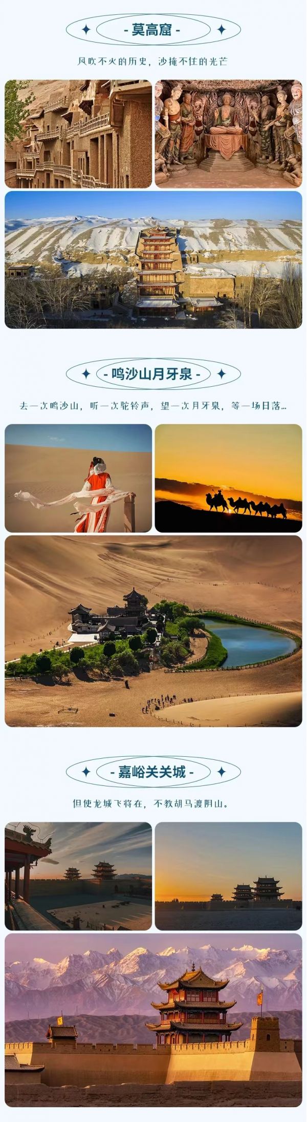 下午我們抵達(dá)敦煌游覽勝地【鳴沙山月牙泉】,千百年來,鳴沙山和月牙泉猶如伴侶一般令人震撼,泉在流沙中,干旱不枯竭,風(fēng)吹沙不落,頗為奇觀。大家可以盡情地游玩,賞泉、爬山、滑沙、騎駱駝……領(lǐng)略大漠風(fēng)情,感受塞外風(fēng)光。