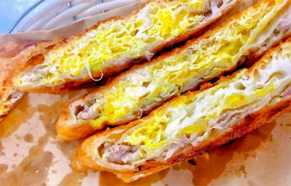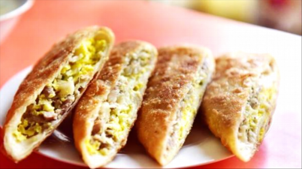 切開的呱嗒色澤金黃,緊實(shí)度很高,確實(shí)如當(dāng)?shù)厝丝谥械摹?strong>呱嗒”,名字雖怪,但著實(shí)好吃。這呱嗒味兒香餡兒滿,那薄薄的酥脆的外皮包裹著味道鮮美的肉和蛋,上、中、下三層均勻地混合在一起,看著就讓人垂涎欲滴。