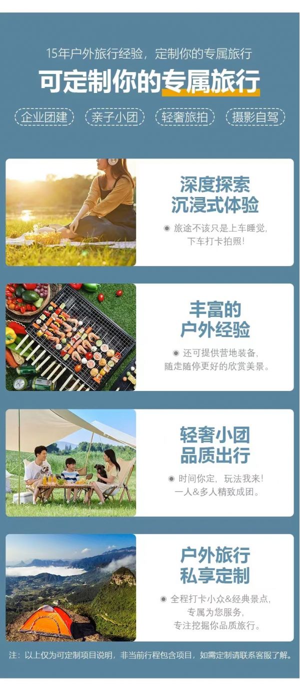 私人訂制:我們業(yè)務范圍囊括了全國各大城市,川西、西北、新疆、西藏,在路上永遠有我們的身影。我們將為每一個有定制需求的你策劃出獨屬于自己的完美旅行。