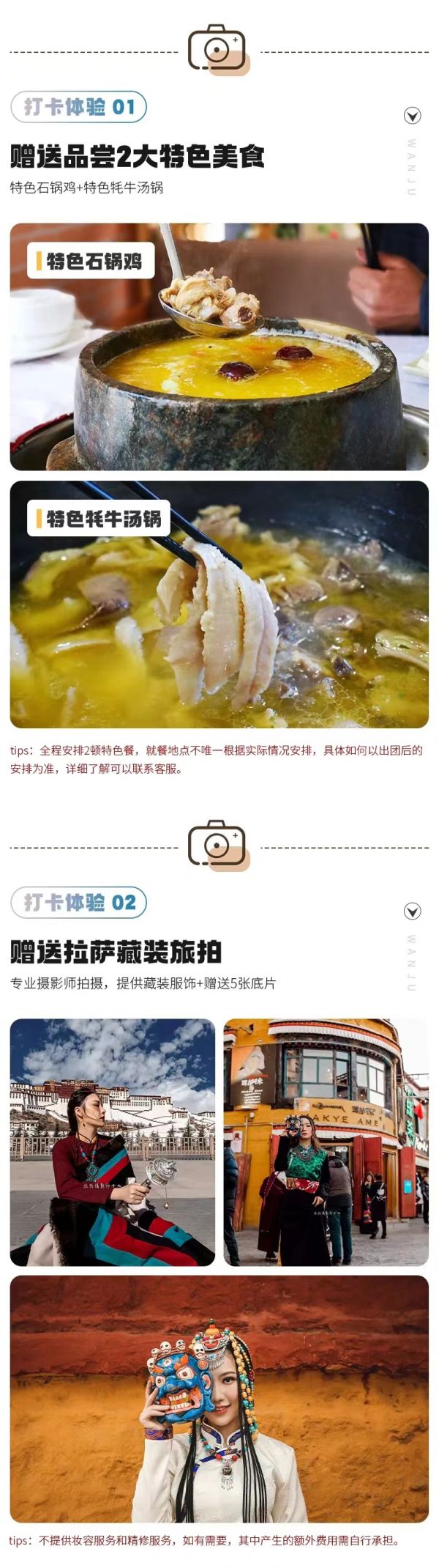 用餐:酒店提供的早餐(若酒店不提供則不包含),贈送2餐特色餐(1頓石鍋雞+1頓牦牛湯鍋)不用不退,其余正餐自理;司機/領隊會根據(jù)大家的需求給出美食推薦,客人可以自行選擇;