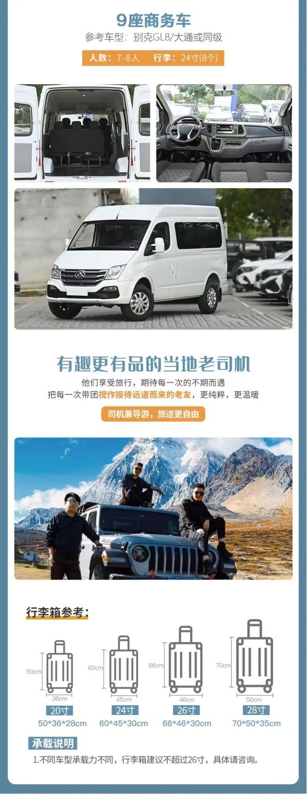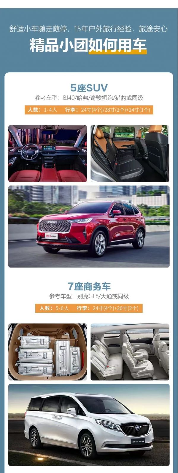 交通:2-8人VIP私享小團,全程舒適商務車出行,車型大小根據(jù)實際人數(shù)安排,保證一人一正座位,且由駕駛經驗豐富的司機為您的出行保駕護航,報價包含車費、油費、停車費、維修費及司機勞務費。