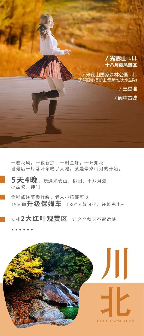 早餐后出發(fā),經(jīng)成巴高速抵達(dá)位于川東北的巴中【光霧山】,光霧山被譽(yù)為“中國紅葉第一山”,因常年云霧繚繞而得名,每年10月~11月是觀賞光霧山紅葉的最佳時(shí)機(jī)?!臼嗽绿丁渴遣卦诠忪F山深處的動人篇章,曾有人說:十八月潭是川東北的“九寨溝”,瀑布似九寨,紅葉絕天下。在長約3.5公里的珍珠溝內(nèi),密布著18個(gè)恍若神造仙成的瀑潭,每個(gè)潭形似月桂,基本上有一相映的瀑布,謂之“十八月潭”。大小水潭似顆顆珍珠綴成的長長珠鏈,沿溝飛瀉的瀑流如粒粒珍珠鋪就的幅幅珠簾。漫步其間,潭水相連,時(shí)而穿過大片彩林,一瀉千里,時(shí)而一片靜謐,明凈幽藍(lán)。登高俯瞰,滿目流金瀉玉、彩虹波動,尤如串串珍珠藏于溝壑溪澗。步入十八月潭,如在畫中游,讓你陶醉得駐足不前??催^秋景后前往光霧山鎮(zhèn)入住。