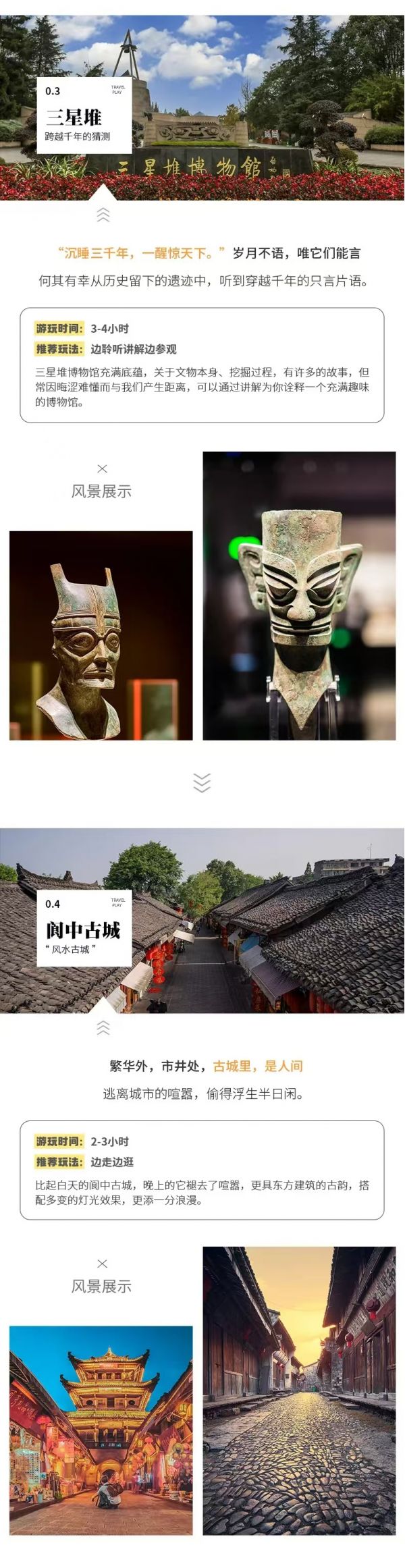 早晨從成都酒店出發(fā),大家相互認(rèn)識,相互熟悉,一路歡歌笑語,充滿期待。隨后抵達(dá)【三星堆博物館】開始參觀,三星堆古遺址距今已有3000至5000年歷史,是迄今在西南地區(qū)發(fā)現(xiàn)的范圍最大、延續(xù)時(shí)間最長、文化內(nèi)涵最豐富的古城、古國、古蜀文化遺址。在這批古蜀秘寶中,有許多光怪陸離奇異詭譎的青銅造型,有高2.62米的【青銅大立人】、有寬1.38米的【青銅面具】、更有高達(dá)3.95米的【青銅神樹】等,均堪稱獨(dú)一無二的曠世神品。而以流光溢彩的金杖為代表的金器,以滿飾圖案的邊璋為代表的玉石器,亦多屬前所未見的稀世之珍。游覽后繼續(xù)出發(fā),下午抵達(dá)【閬中古城】,古城山圍四面,水繞三方,有著2300多年的歷史,與安徽黃山的徽州古城、山西平遙的平遙古城和云南麗江的麗江古城并稱為中國四大古城,如果說麗江古城是風(fēng)花雪月,那么閬中古城便是人間煙火,古城里時(shí)不時(shí)飄出的陣陣醋香更是久久縈繞在心頭,古城所蘊(yùn)含的三國文化、春節(jié)文化、科舉文化更是值得深入探究。晚上我們?nèi)胱」懦侵苓叄绕鸢滋斓拈佒泄懦?,晚上的它褪去了喧囂,更具東方建筑的古韻,搭配多變的燈光效果,更添一分浪漫。