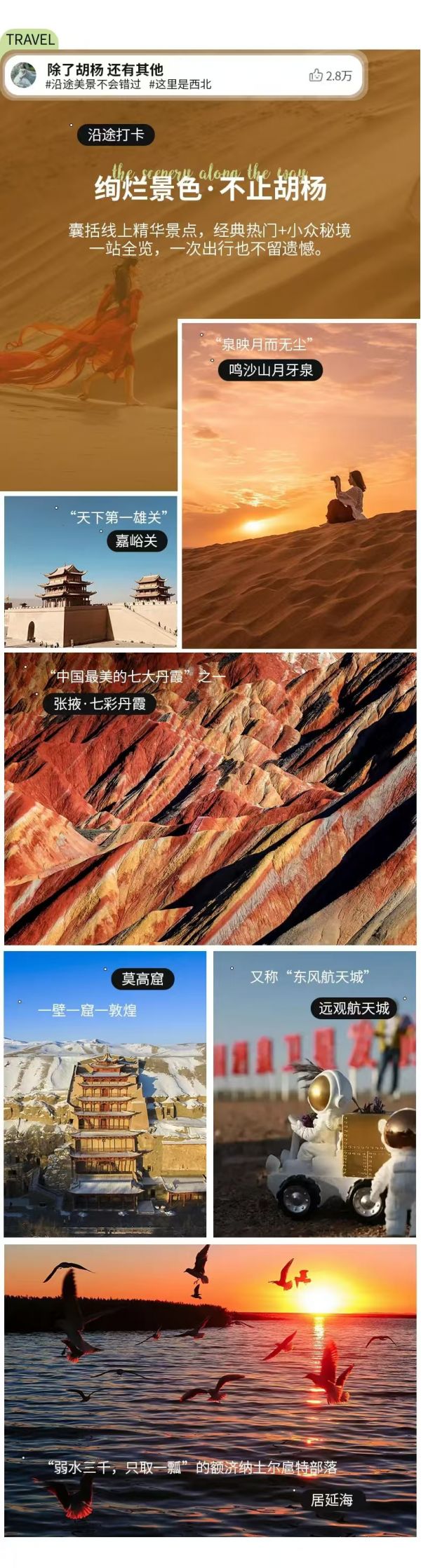 今天辛苦大家起個(gè)早床,一起早起前往【居延?!颗臄z日出,日出大概在7點(diǎn)到7點(diǎn)半左右,居延海是《水經(jīng)注》里提到的弱水流沙之地,也是土爾扈特族發(fā)展的搖籃,現(xiàn)在是一片長(zhǎng)滿蘆葦?shù)暮W?,日出時(shí)分場(chǎng)面相當(dāng)壯闊宏大。當(dāng)東方的太陽越出水面,霞光四射,水天瞬間都染成通紅,滿湖面的鷗鳥此起彼落,翱翔翻飛,海子周邊的蘆葦蕩隨風(fēng)飄動(dòng),這副日出盛景一定會(huì)讓你不悔起得早。然后開啟額濟(jì)納一日深度體驗(yàn)胡楊林之旅。
