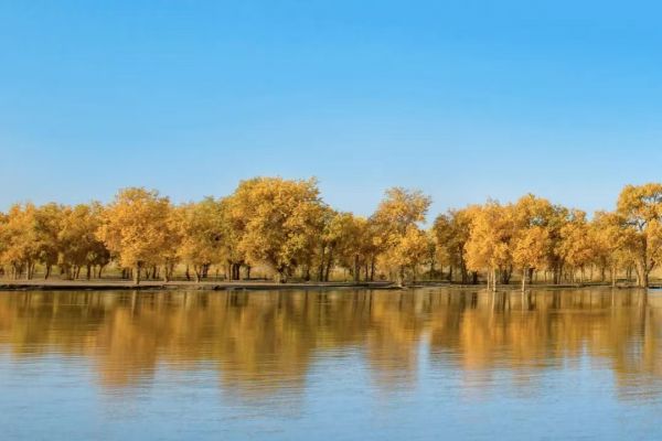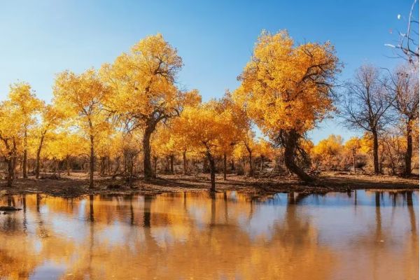 3、選擇好襯托物:以天空的藍(lán)色,加上白云的點(diǎn)綴,襯托出胡楊林的金黃色,或以湖水為背景,貼近湖面,拍攝出大小不一的金黃倒影;