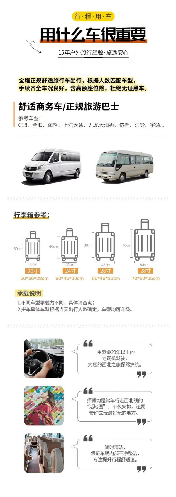 ● 服務(wù):10人及以上(包含10人),提供持證正規(guī)領(lǐng)隊(duì)服務(wù);10人及以下,由經(jīng)驗(yàn)豐富的司機(jī)帶隊(duì),無單獨(dú)導(dǎo)游服務(wù),請(qǐng)諒解。
