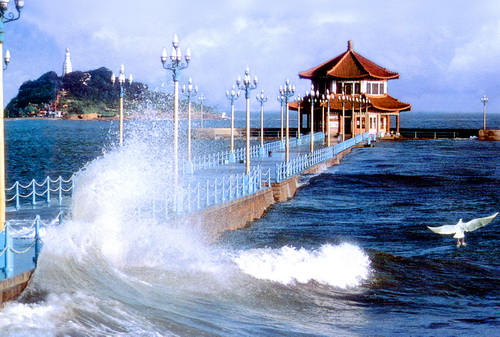 棧橋是青島的象征。位于青島灣中,與市內(nèi)最繁華的中山路成一條直線,由海岸前伸入海,素有“長虹遠引”之美譽。棧橋初建于光緒十八年(公元1892年),是青島最早的碼頭。經(jīng)1931年改建和1985年整修,現(xiàn)寬8米,全長440米。版權(quán)所有山東聊城聊之旅國際旅行社有限公司,轉(zhuǎn)載必究!橋南端筑半圓形防波堤,堤內(nèi)是一座具有民族風(fēng)格的兩層八角亭,金瓦朱壁,盔頂飛檐,題名“回瀾閣”。棧橋劃波斬浪,像一條長龍橫臥于碧海銀波。循橋漸入,仿佛走進大海的懷抱;佇立閣旁,層層巨浪澎湃涌來,拍打堤壩,擊起萬千碎玉;入閣內(nèi),沿螺旋樓梯登到樓上,四周盡是寬敞的大窗,放眼望去,又是另一番怡人風(fēng)景,“飛閣回瀾”因此被譽為“青島十景”之一。