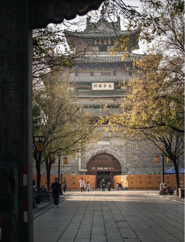 ? 外觀布局:外觀為四重檐歇山十字脊過(guò)街式樓閣,由墩石和主樓兩部分組成,通高和四邊長(zhǎng)都是33米,即古代的九丈九尺,有不可超越之意。