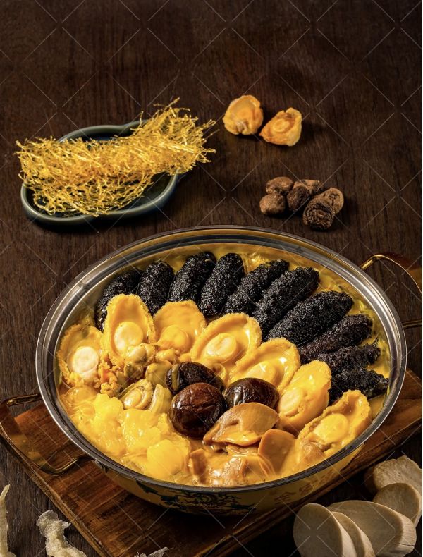 食材:選料精細(xì),通常有鮑魚、海參、魚翅、干貝、魚唇等30多種原料,葷素搭配,包括肉、海鮮、冬菇、冬筍等。