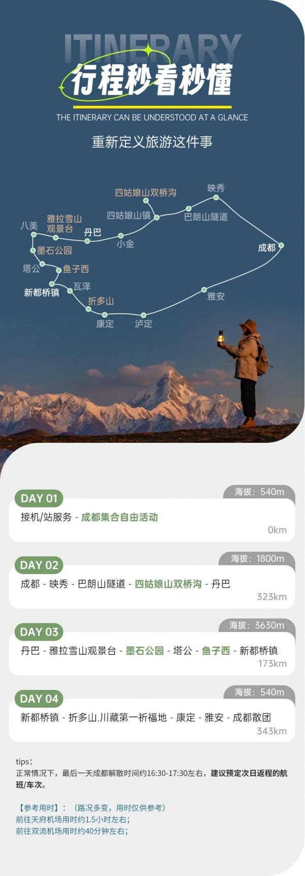 聊城適時赴成都,抵達成都前后會有接機/站的師傅與您取得聯(lián)系接機/站的時間。您可以根據(jù)到達時間安排今日的自由活動。