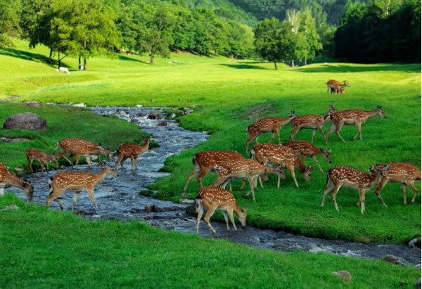 早餐后游九峰山養(yǎng)心谷景區(qū):(距伊春1.5小時左右,游覽時間約2小時左右)中國十佳魅力生態(tài)景區(qū)---國家4A景區(qū)九峰山養(yǎng)心谷。九峰山可以用四句話來形容——九潭九瀑九龍柱,九橋九亭九花仙,九茶酒水九養(yǎng)地,九溝九溪九峰山。九峰山養(yǎng)心谷景區(qū)2016年以其獨特的養(yǎng)生文化被評為國家AAAA級景區(qū),景區(qū)總占地面積5280公頃,景區(qū)分為東區(qū)、中區(qū)、南區(qū)及西區(qū),景區(qū)以康養(yǎng)+旅游,研學游,生態(tài)游為主導思想,讓游客在游玩的同時與大自然徹底融合,調(diào)節(jié)身體各項細胞,真正的返樸歸真,最終實現(xiàn)森林康養(yǎng)的愿望!景區(qū)森林的覆蓋率高達95%以上,龍舌瀑布和神瀑水潭,貔貅潭、過水橋等水系環(huán)繞,林下植被豐富,水系發(fā)達,負氧離子濃度高。觀賞動物,暢游花海,中餐后游,中餐后去游覽金山鹿苑(車程約10分鐘左右,游覽時間約2小時):坐落在伊春市金山屯區(qū)境內(nèi)、占地面積有60公頃、鹿苑內(nèi)偌大的草坪寬闊平整、地勢微微起伏、中間一條小溪從山間緩緩流下、溪水清澈見底、宛如一個天然的高爾夫球場、偌大的草坪四周群山環(huán)抱、山腳下圍著草坪一條環(huán)形棧道、可以悠閑地圍著鹿苑草坪漫步、鹿苑以半開放的形式散養(yǎng)著幾百頭梅花鹿和天山馬鹿、小鹿兒在溪流間嬉戲、在草坪上奔跑、由于自然生態(tài)環(huán)境適宜、也經(jīng)常有野生鹿出沒、鹿苑腹地占有大半個山頭、山間的草坪、樹林、溪流渾然一體、形成一幅祥和獨特的自然美景!