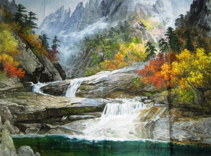 然而有趣的是,金剛山隨著四季的變換,在四季里有四個不同的名稱。春季,在明媚的陽光的照射下,巍然屹立的山峰,閃閃發(fā)光,遠遠望去就像是一塊閃耀著的金剛石,因此叫作金剛山;夏季,林木蔥郁,松林云海,又稱蓬萊山;秋季,層林盡染,楓葉勝火,漫山紅遍,又稱楓岳山;冬季,草木凋零,石骨嶙峋,又名皆骨山。